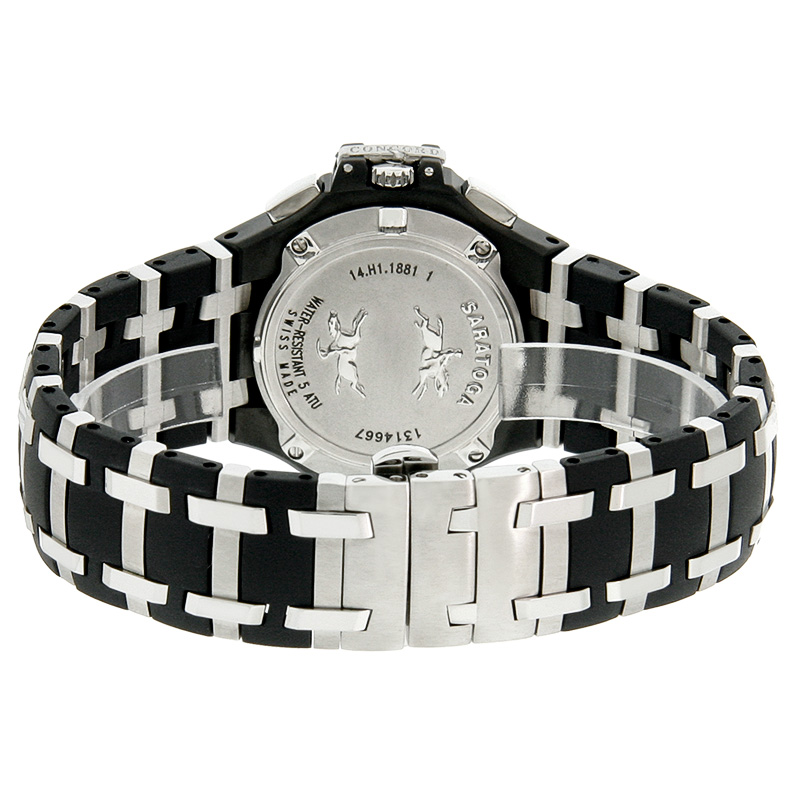 Add a modern pop of style to your look with this sleek stainless steel watch from Concord. A smooth black dial, easy-to-read calendar date and comfortable two-tone bracelet makes this watch the perfect way to stay on time and in style.